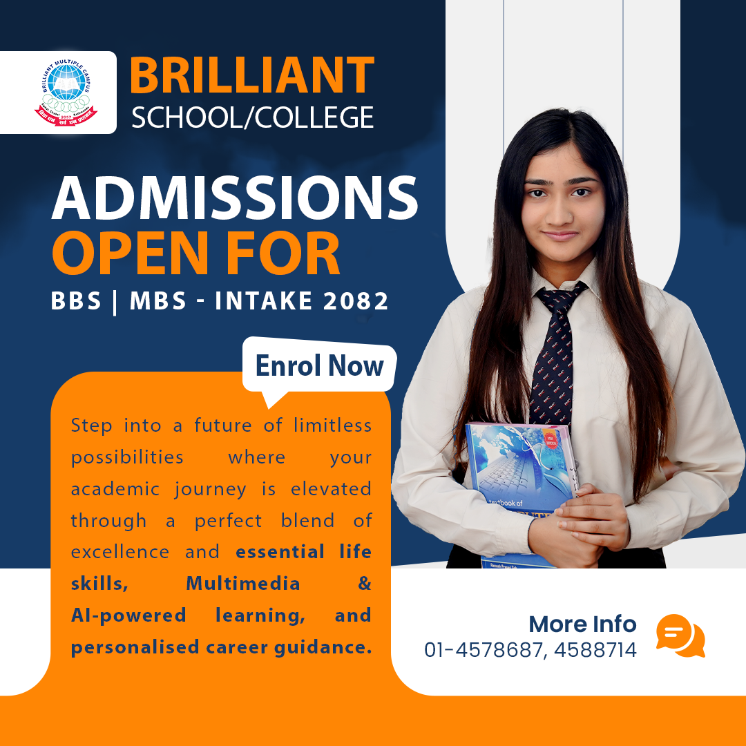 Welcome to Brilliant College for the academic year 2081! Since our founding in 2057 BS, weโve been committed to academic excellence and helping students discover, grow, and create a better future. Our college is dedicated to identifying and nurturing studentsโ potential, equipping them with both academic knowledge and crucial soft skills.We emphasize problem-solving, communication, information technology, collaboration, critical thinking, creativity, and emotional management through our extracurricular and co-curricular activities. Our goal is to mold students into skilled individuals ready for the professional world. Our teachers are adept at applying 21st-century skills and digital methods to effectively engage with Generation-Z learners.